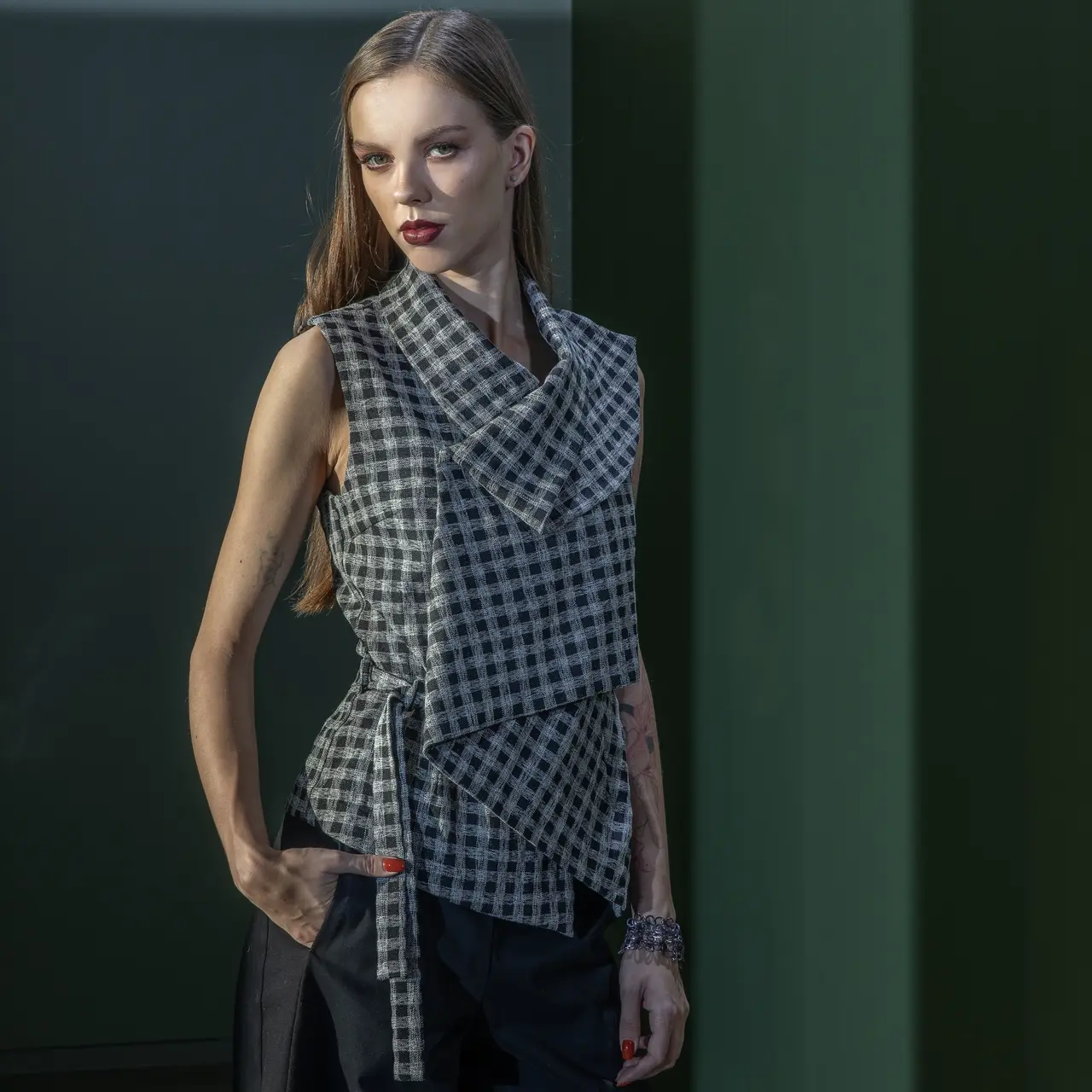 Lappes krae ja hõlmaga vest-topp. Varrukateta. Hõlmad vaheliti. Kinnitatud kahe suure trukiga. Vasakul küljeõmbluses väike ava vöö jaoks. Seotav vöö. Voodrita. Kangas pehme, strechib, ja langeb hästi.