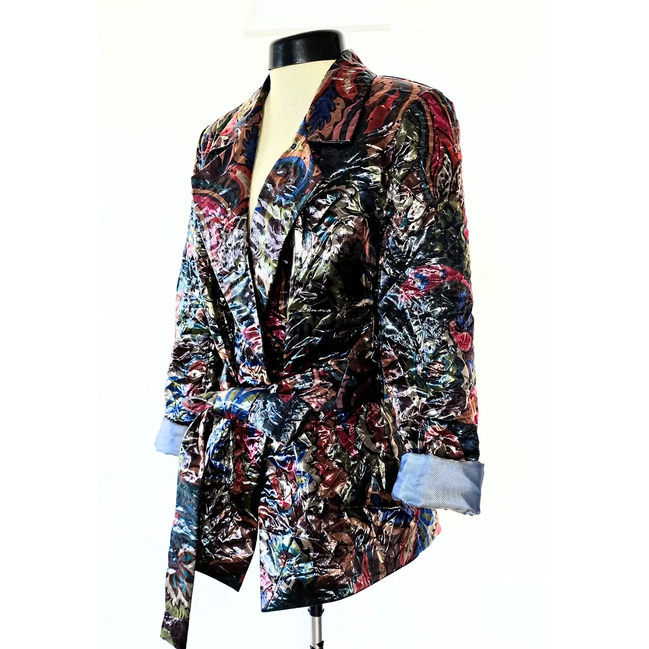 Mustrilisest läikivast kortsulisest kangast vööga reväärkraega jakk. Voodriga. Küljeõmbluses taskud.