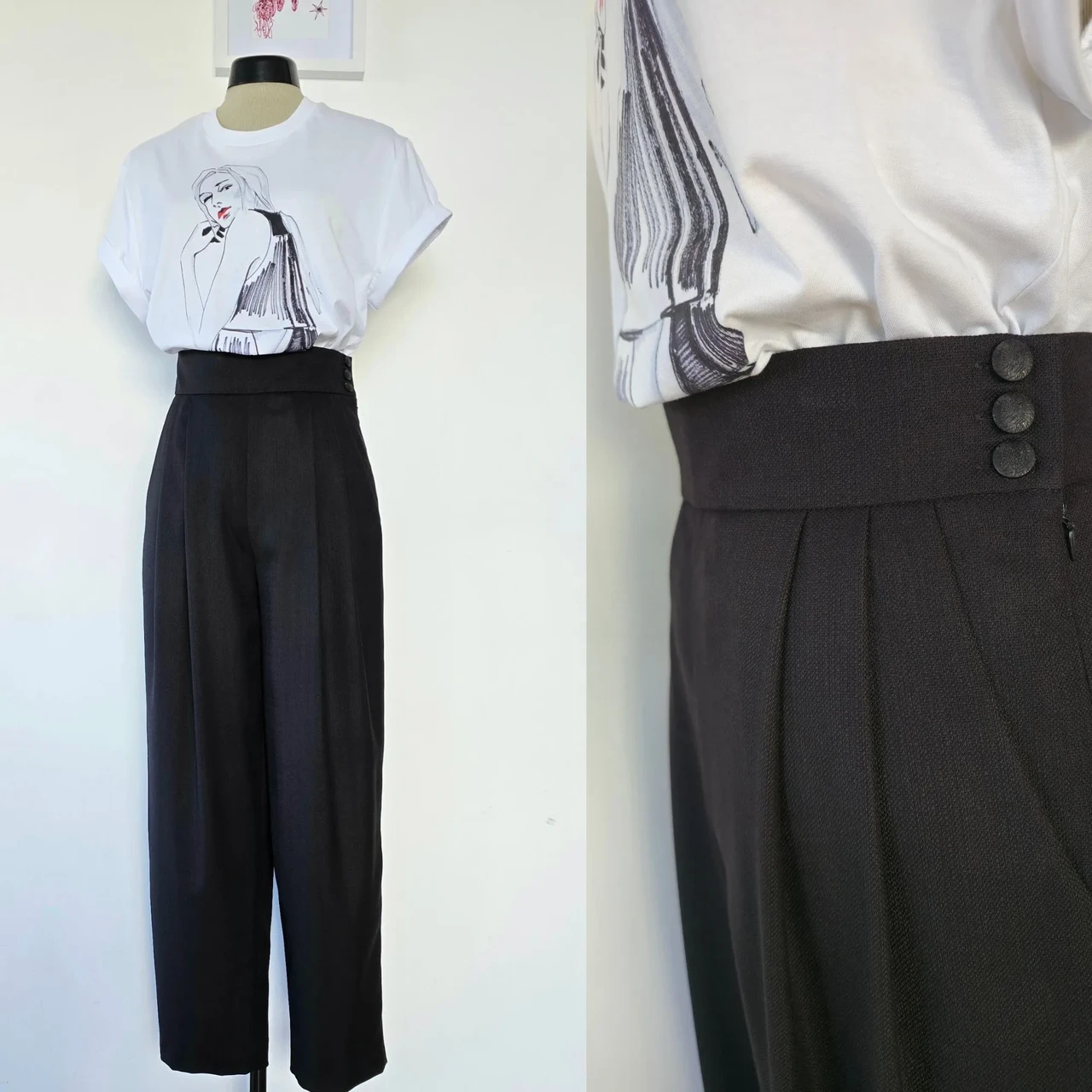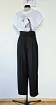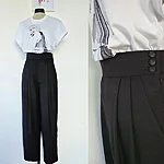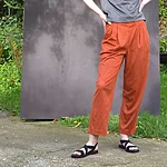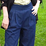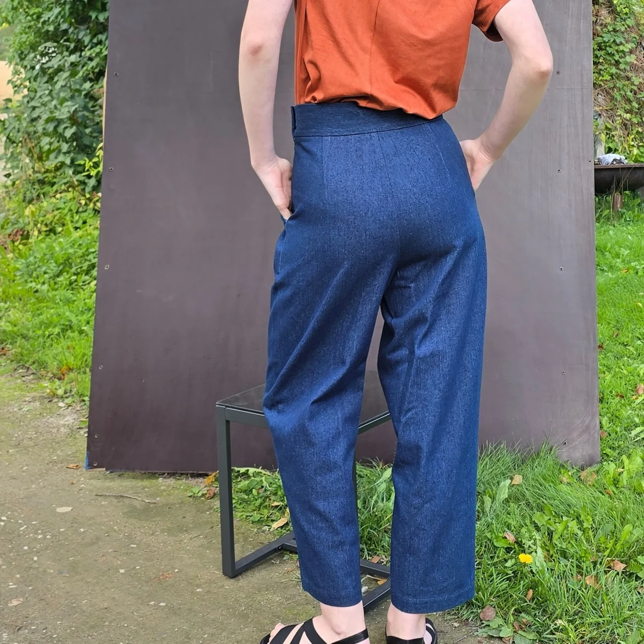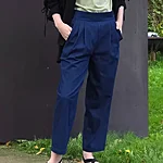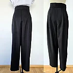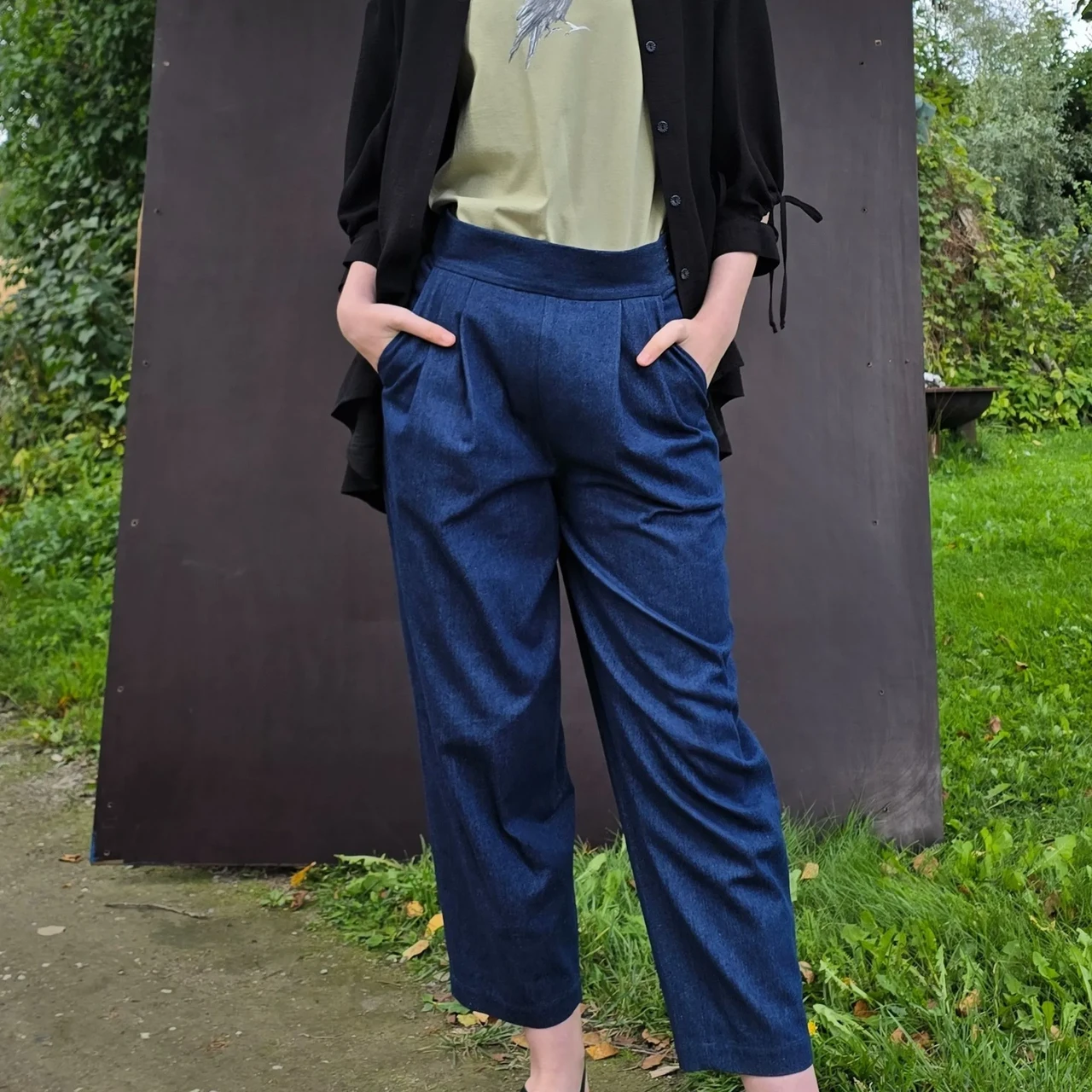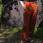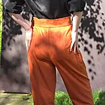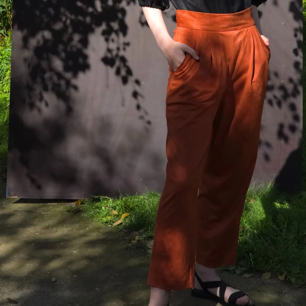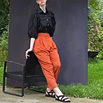 Laia värvliga, voltidega püksid. Värvlil 3 väikest nööpi. Lukk küljel. Taskutega.Tehtud hästi langevast, mittekortsuvast, veidi venivast kostüümikangast või sinisest pestud pehmest teksast või seemisnahkse tundega tumeoranžist kangast. Alt kitseneva siluetiga sääred. Pikkus pahkluuni. (Modelli pikkus pildil 181cm)