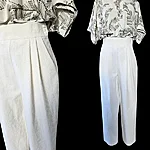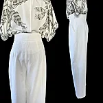 Laia värvliga, voltidega püksid. Värvlil 3 väikest nööpi. Lukk küljel. Taskutega.Tehtud hästi langevast, mittekortsuvast, veidi venivast kostüümikangast või sinisest pestud pehmest teksast või seemisnahkse tundega tumeoranžist kangast või struktuurse triibuga naturaalvalgest puuvillakangast. Alt kitseneva siluetiga sääred. Pikkus pahkluuni. (Modelli pikkus pildil 181cm)