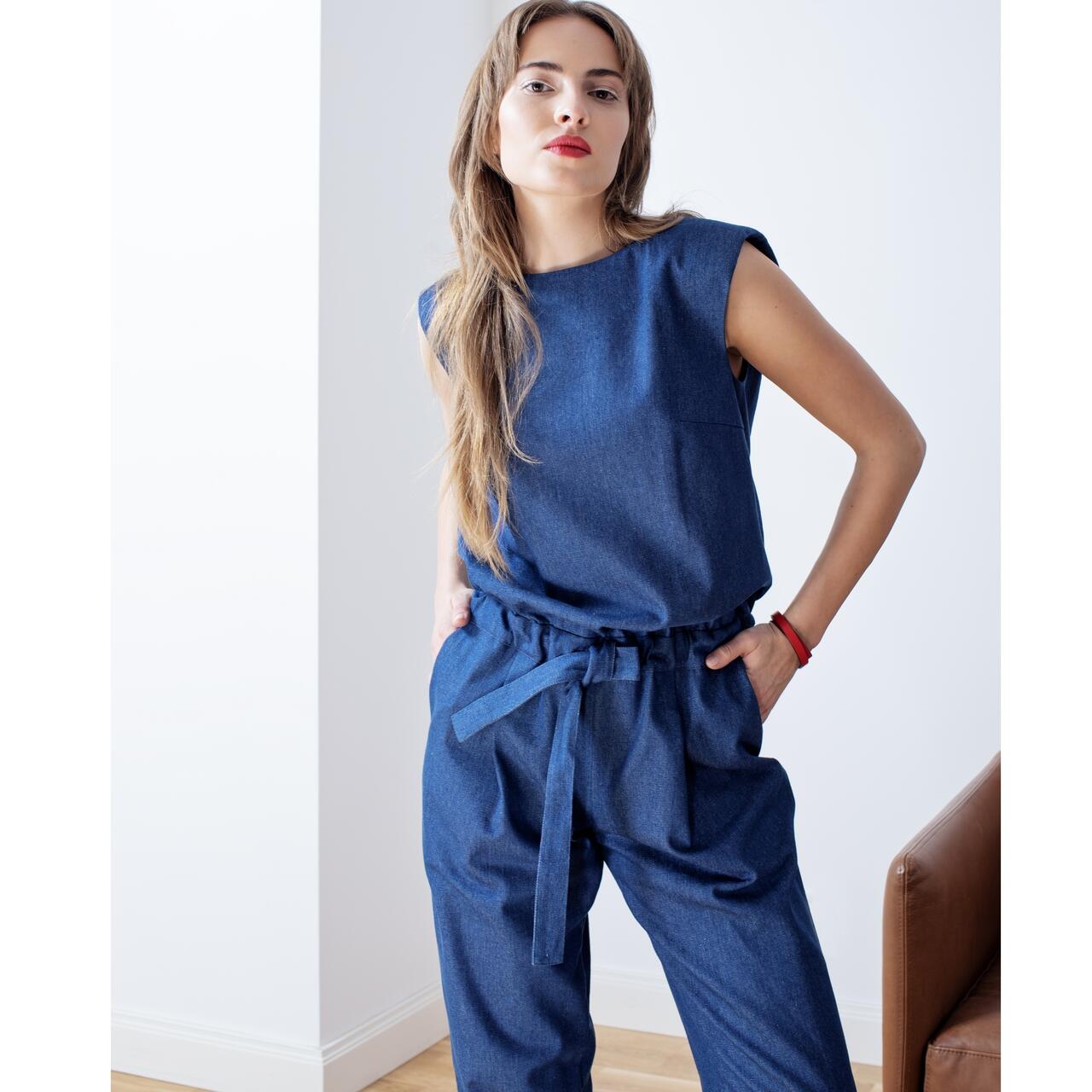 Dark blue denim jumpsuit or black and white cotton satin jumpsuit. Top part has loose fit. Thin shoulder pads. Fastens at the back with two buttons. Top lined with a light fabric. Pants with pockets, front pleats and tapered legs. The jumpsuit features a drawstring waistband in a tunnel.