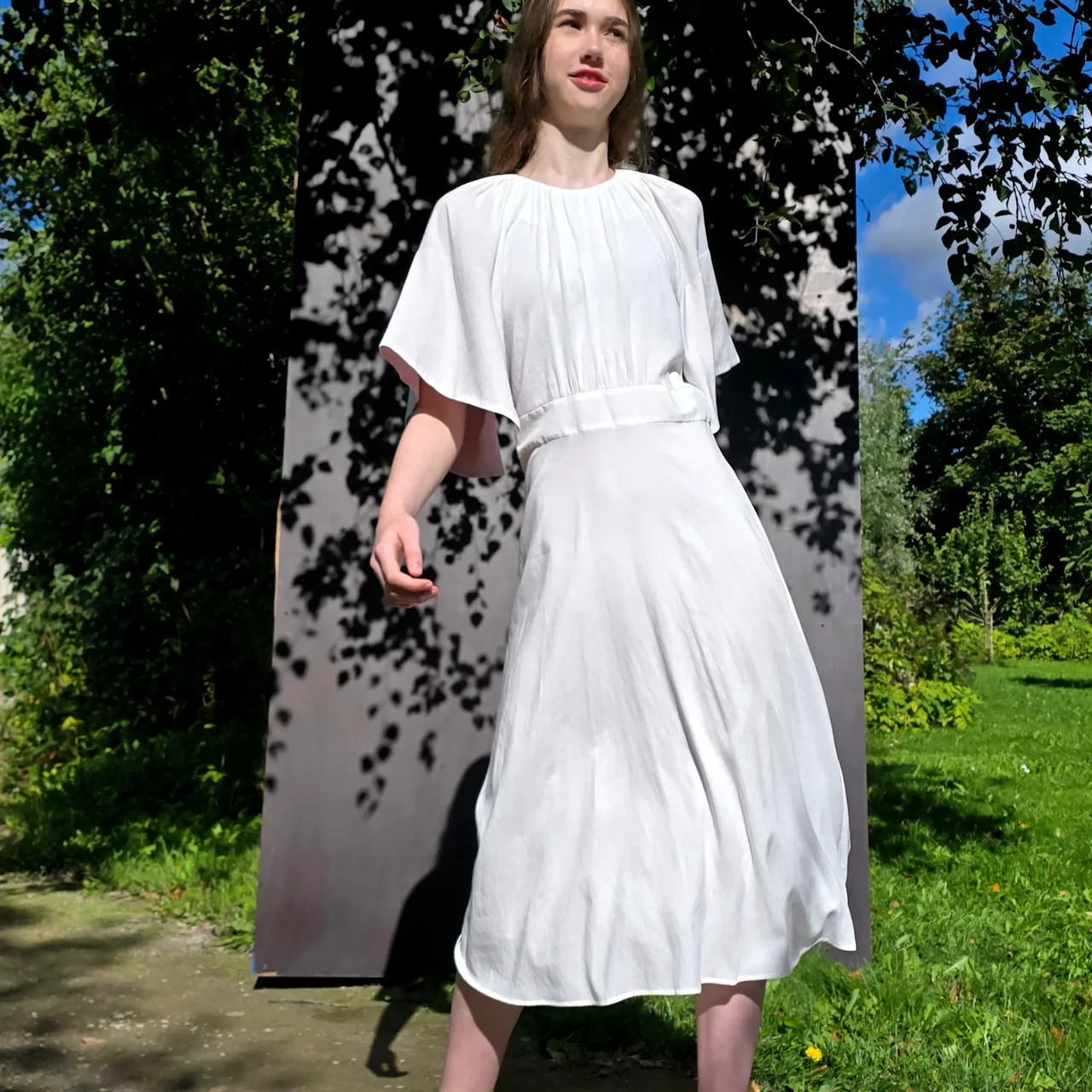 Naturaalvalgel kleit õhukese veidi veniva voodriga. Varruka sisemine pool vanaroosa.