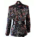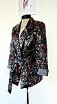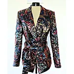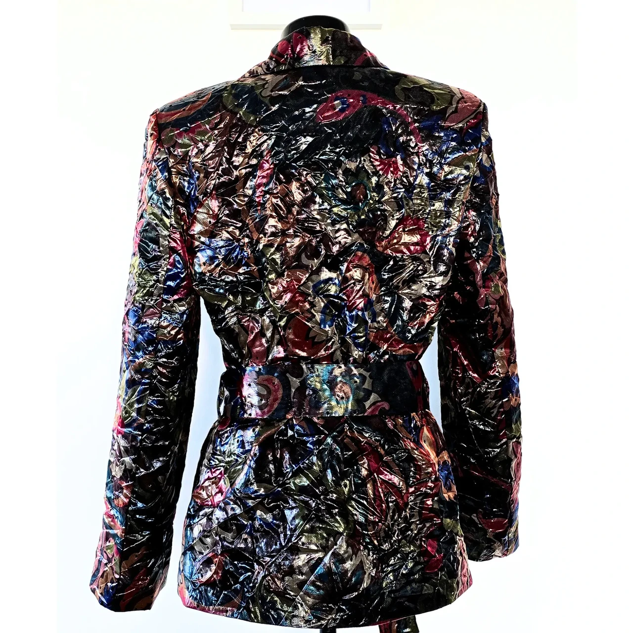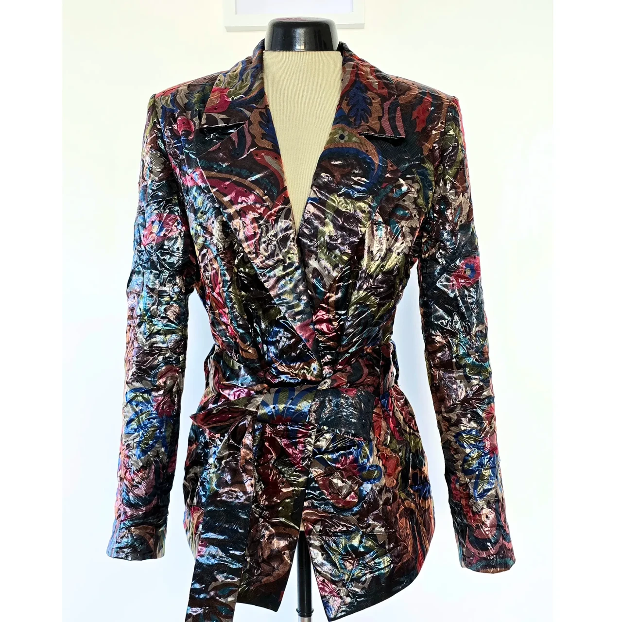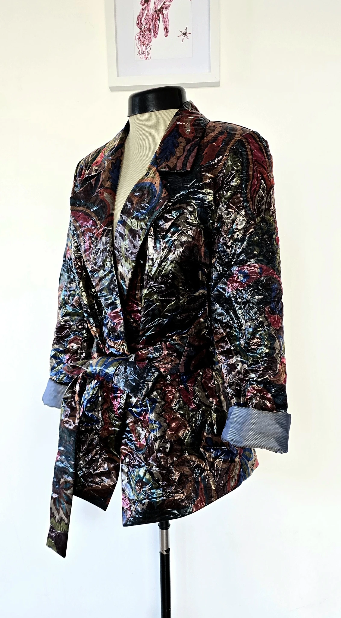 Mustrilisest läikivast kortsulisest kangast vööga reväärkraega jakk. Voodriga. Küljeõmbluses taskud.