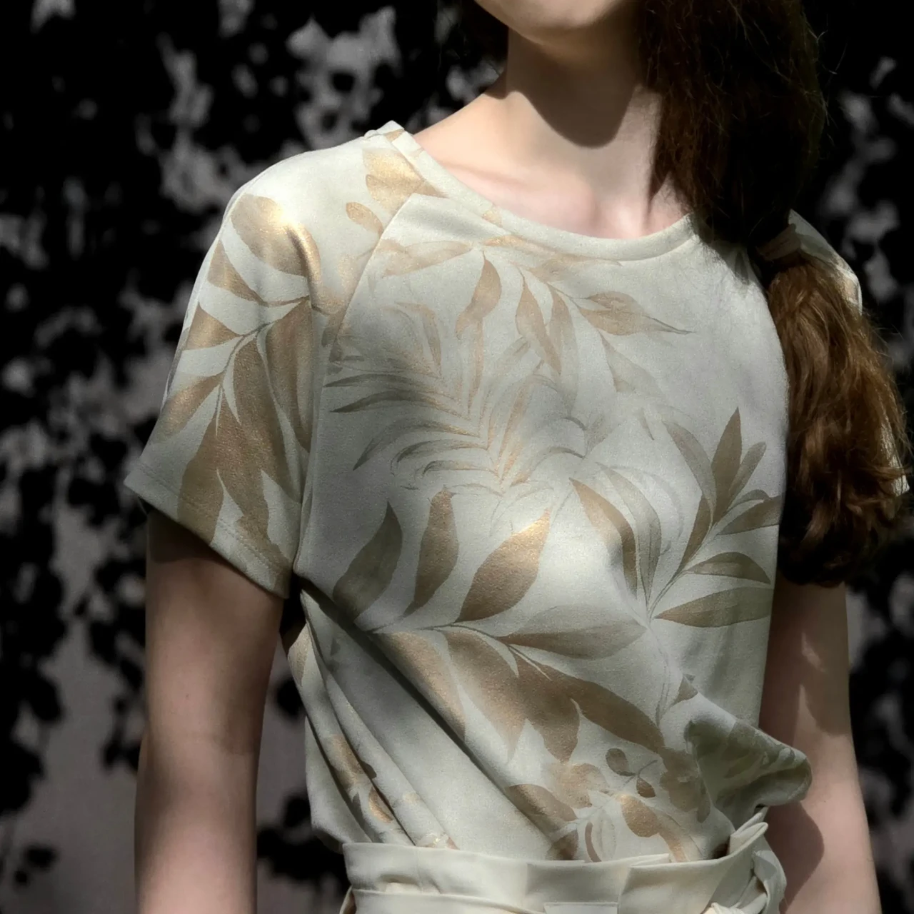 Heavier jersey top in beige with golden print, light green viscose or suede-feel hevier jersey in dark orange or grey. Short raglan sleeves. Diagonal seams. Slightly shorter at the front, with a rather loose silhouette around the bust. Neckline finished with inner binding. Care: machine wash at 30