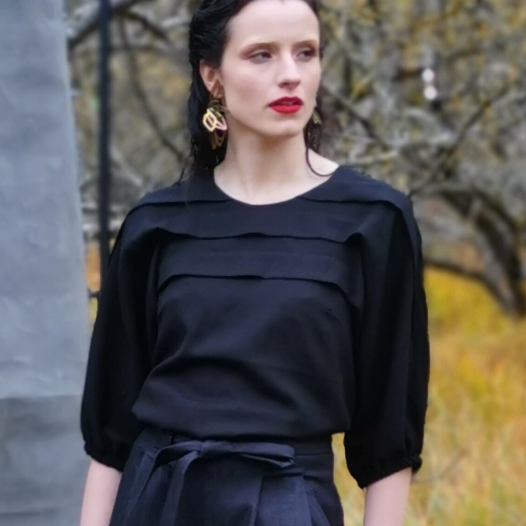 Volditud rinnaga topp. Seljal väiksed tahulised nööbid. Poolvarrukaga. Varruka otsas kitsas kumm. Ülemine volt lõpuni kinni õmmeldud, teine ja kolmas volt ainult rinnaosal kinni õmmeldud.