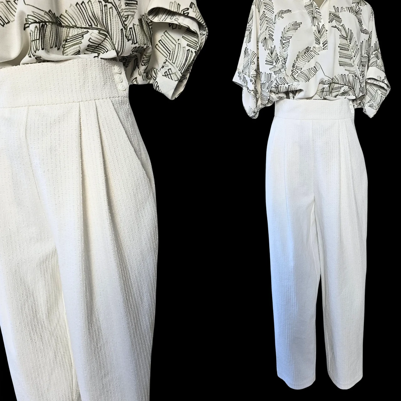 Laia värvliga, voltidega püksid. Värvlil 3 väikest nööpi. Lukk küljel. Taskutega.Tehtud hästi langevast, mittekortsuvast, veidi venivast kostüümikangast või sinisest pestud pehmest teksast või seemisnahkse tundega tumeoranžist kangast või struktuurse triibuga naturaalvalgest puuvillakangast. Alt kitseneva siluetiga sääred. Pikkus pahkluuni. (Modelli pikkus pildil 181cm)
